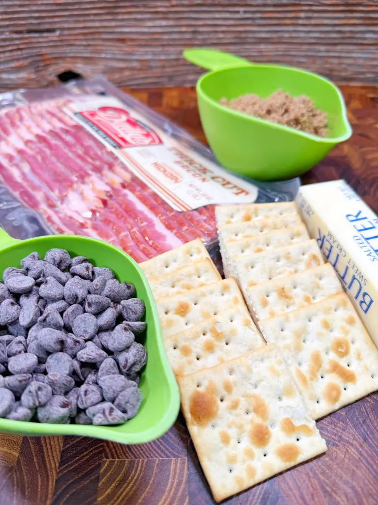 You’ll only need a few simple items to whip up this chocolate bacon crack recipe. Grab yourself a sleeve of saltine crackers, dark brown sugar, unsalted butter, crispy bacon pieces, and some semisweet chocolate chips or milk chocolate.
