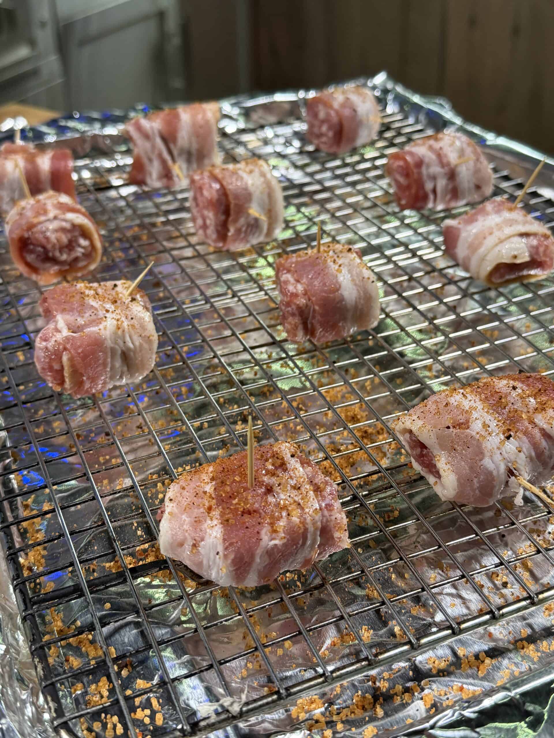 Once wrapped, secure each piece with a toothpick and season lightly with Pork’N rub or your favorite BBQ rub. You don’t need a heavy hand here since the bacon already brings plenty of salt.