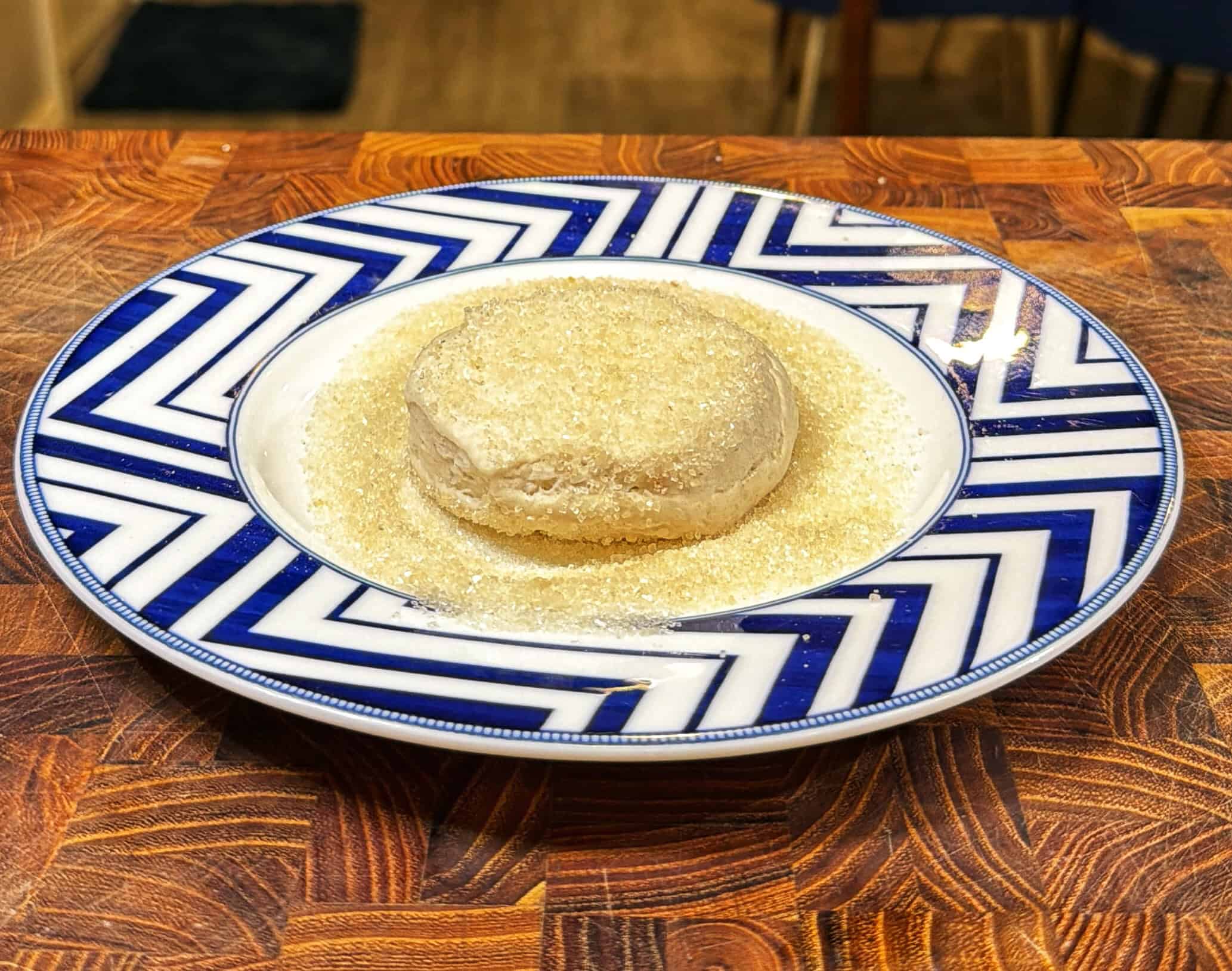 - Separate the biscuits and flatten each one on a plate. Sprinkle granulated sugar on both sides of each biscuit, pressing gently so the sugar adheres and slightly embeds into the dough.