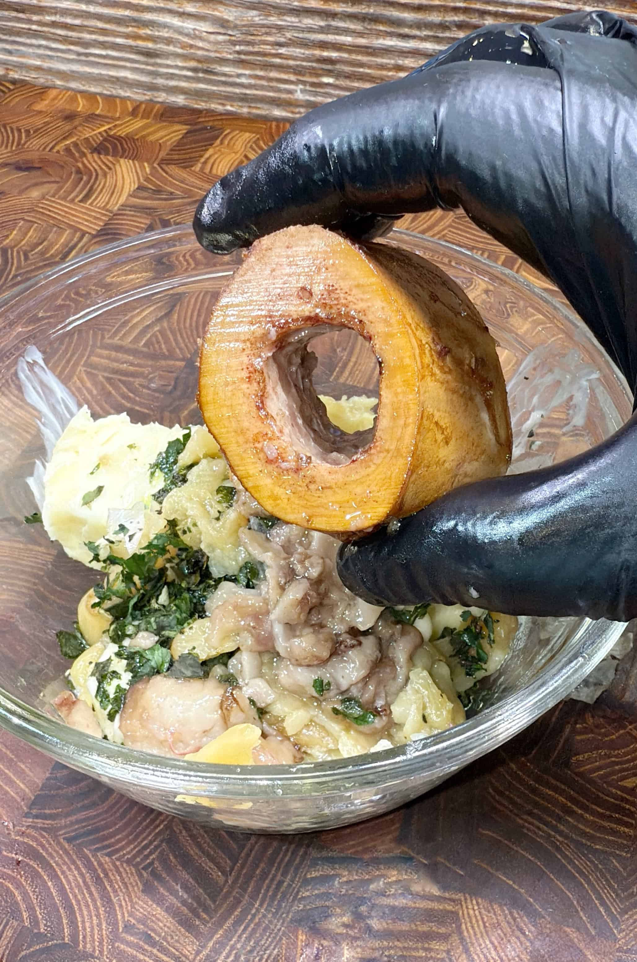 - When garlic and bone marrow is ready, remove from smoker or oven and allow to cool for 5-10 minutes to make them easy to work with. While hot, squeeze roasted garlic cloves into a bowl. Mash with softened butter, salt, pepper and bone marrow to create a garlic butter spread.