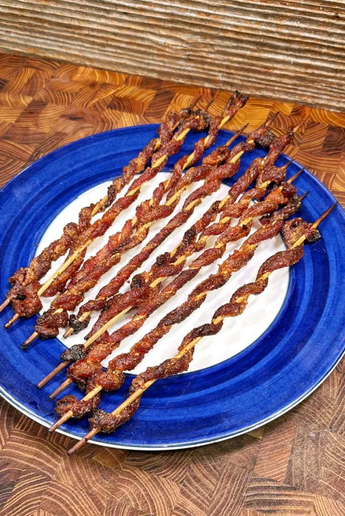 - When bacon is coated, holding one end in each hand, twist the bacon until it's nice and tight (this is where the magic happens) then place one end of skewer through end of bacon. Wrap twisted bacon around skewer in a spiral pattern, place other end of bacon through skewer on bottom end.