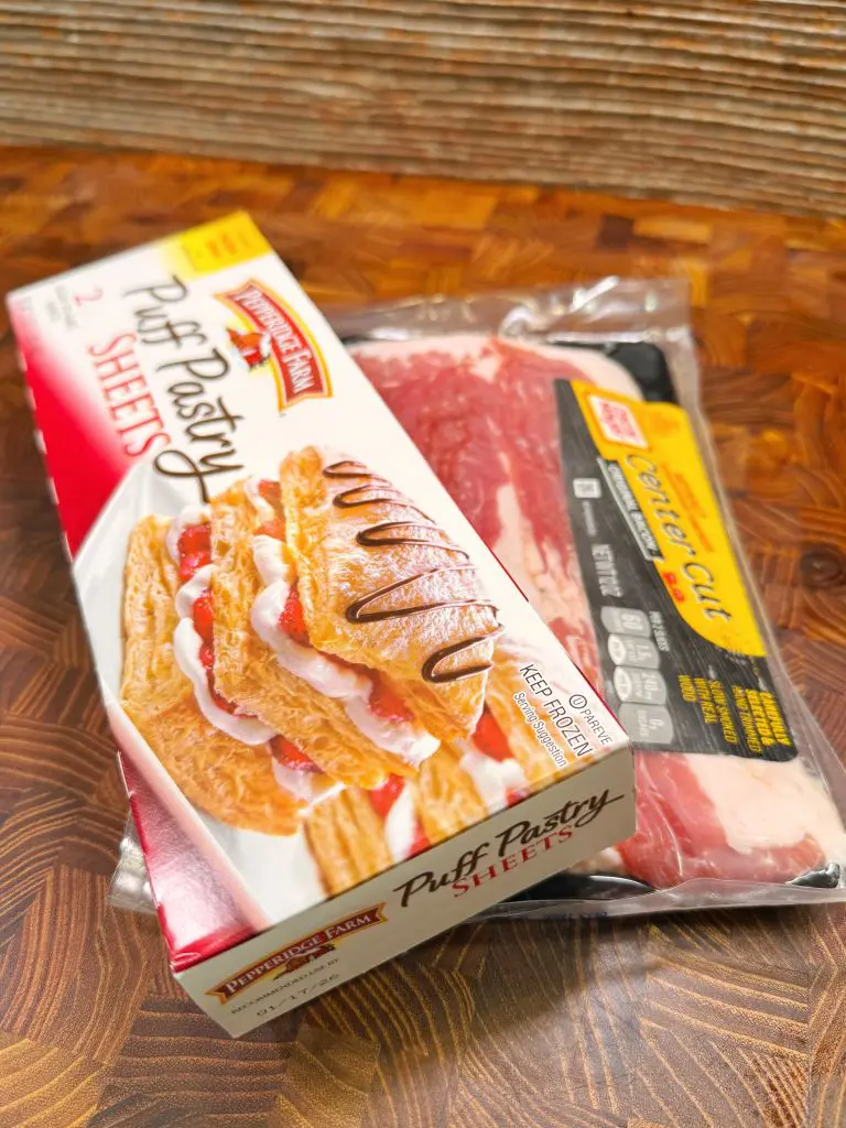 Pro Tip: Normally I say anything with puff pastry needs an egg wash. This is the exception. The pastry strip will get all of the flavor and crispiness it needs from the salty bacon.