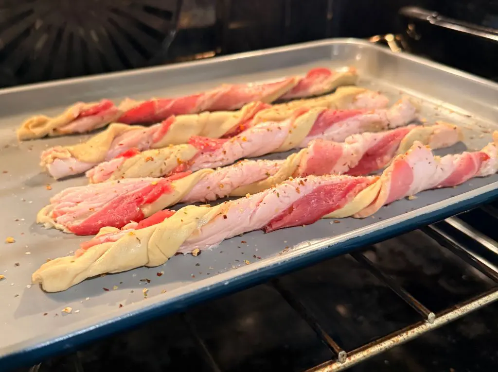 - Twist the pair of puff pastry and bacon together and lay on baking sheet. Season with your favorite pizza / Italian Seasoning
