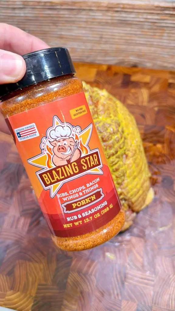 - Slather ham in yellow mustard, and add BBQ rub or seasoning